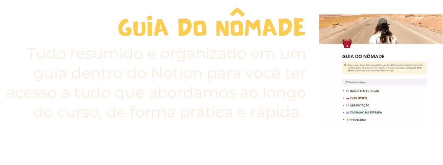 Nesta turma, as aulas de inglês, a comunidade no whatsapp, o acesso à Nôma (nossa IA) e o guia nômade fazem parte desta entrega. Para os três primeiros, estes serão liberados após os 30 dias da garantia. O guia nômade no Notion, é liberado automaticamente conforme o engajamento e comprometimento com as aulas. Ao atingir 60% do conteúdo assistido, ele é liberado automaticamente.